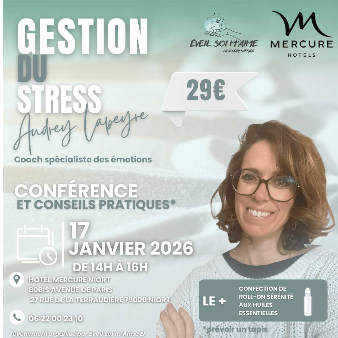 Vous souhaitez mieux gérer votre stress au quotidien ? Le samedi 17 janvier 2026 de 14h à 16h à l’Hôtel Mercure Niort, Audrey Lapeyre, spécialiste de la gestion émotionnelle et fondatrice d'Eveil soi m'Aime coaching, vous propose une conférence autour de la gestion du stress.